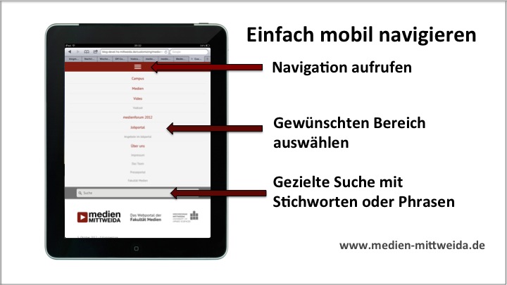 Wichtigster Grund für die Entscheidung unser Webportal „rundzuerneuern“ war, dass unsere Inhalte künftig auch auf mobilen Endgeräten wie Tablets und Smartphones genutzt werden können. Dabei mussten wir den Kompromiss eingehen, zwischen nicht mehr ganz so magazinartiger Darstellung der Seiten auf großen Bildschirmen einerseits, allerdings mit der Gewähr, dass andererseits auf mobilen Endgeräten eine einfache Navigation möglich ist.