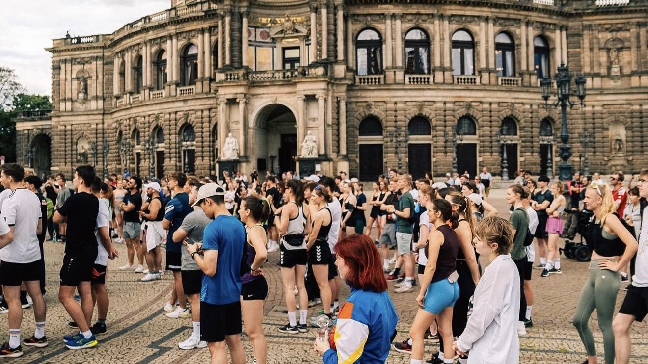Gegen 18 Uhr sammeln sich rund dreißig junge Menschen auf dem Theaterplatz in Dresden. Vor der Semperoper entstehen kleine Inseln aus Gesprächen, während eine Musikbox leise läuft. Einige dehnen sich, andere binden konzentriert ihre Schuhe. Viele sind allein gekommen, ein paar in Zweiergruppen. Die Stimmung wirkt zwanglos und gleichzeitig energiegeladen, als hätten alle schon den ganzen Tag darauf gewartet, endlich loszulaufen.