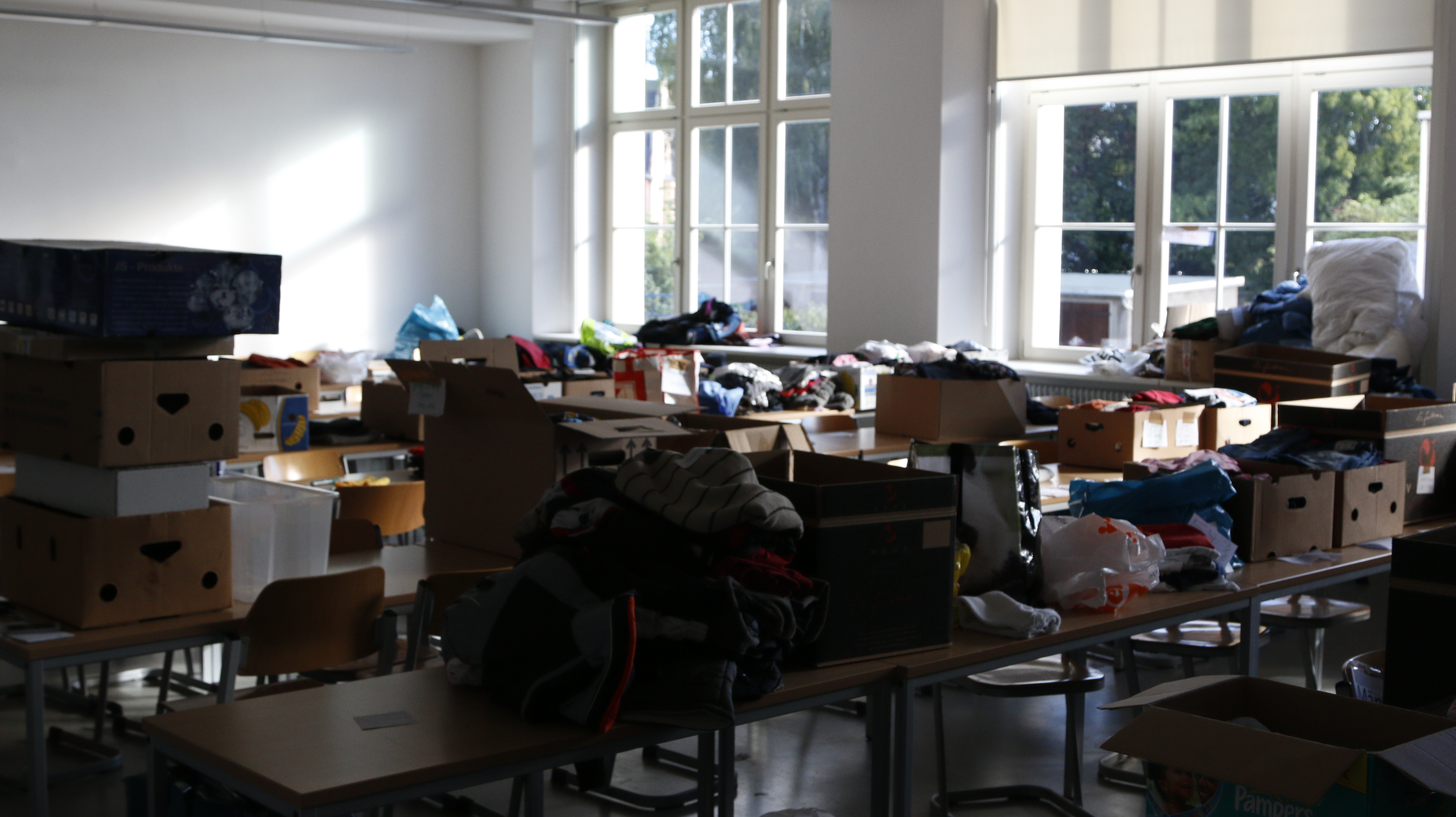 - Ein Teil der noch unsortierten Sachspenden in den Hochschulräumen.