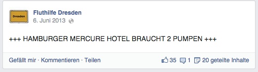 Das Hochwasser im Juni 2013 traf viele Städte im Freistaat Sachsen schwer. Eine zentrale Rolle in der Krisen-Kommunikation spielte hierbei jedoch die selbst organisierte Hilfe in den sozialen Netzwerken. Über die Facebook-Seiten „Elbpegelstand“, „Fluthilfe Dresden“ und „Hochwasser Dresden“ konnten betroffene Bürger ihren Hilfeaufruf starten, denen die ehrenamtlichen Helfer dann folgten.
