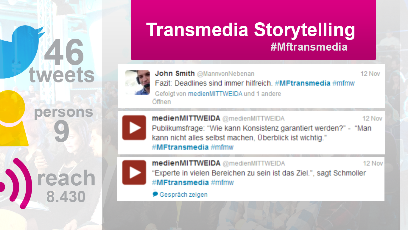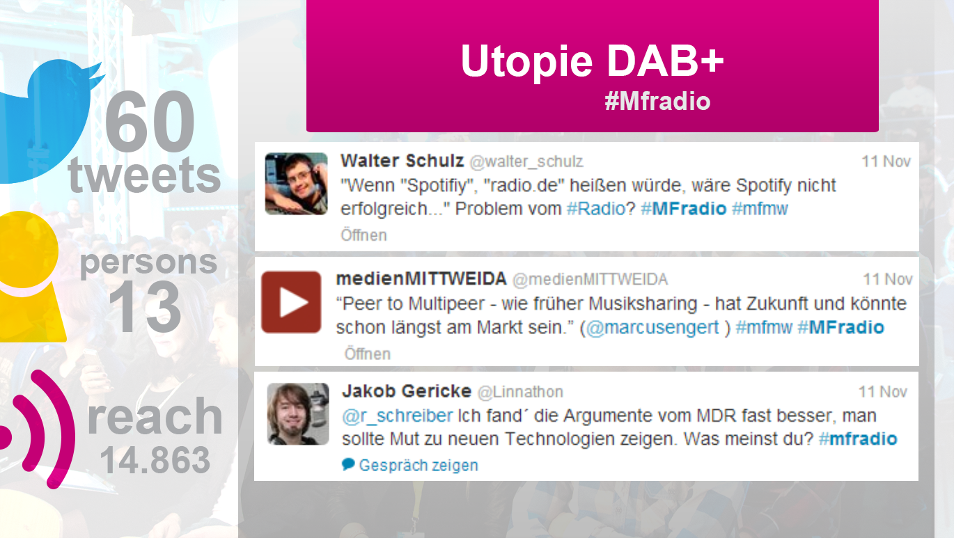 Freue mich auf Tag 2 in Mittweida RT @wasmitmedien Wir empfehlen euch die Videostreams v. Medienforum Mittweida http://t.co/Sts3djodK2 #mfmw — Daniel Fiene (@fiene) November 12, 201h3