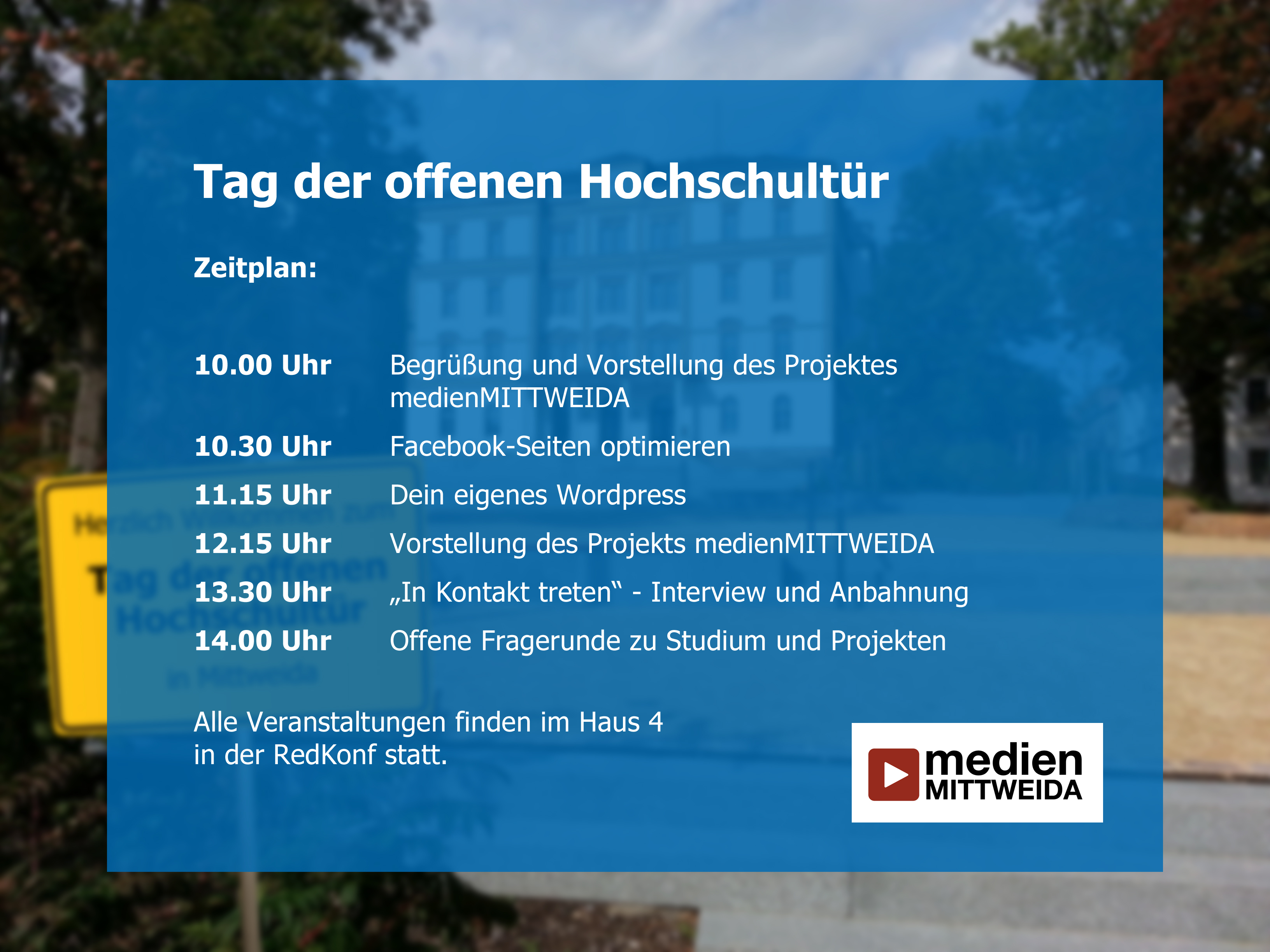 Im Haus 4 stellen sich die studentischen und akademischen Medienprojekte vor und bieten Informationsrunden, Vorträge und sogar ein Gewinnspiel: Mit Hilfe eines Flyers – der „Medien-Schatzkarte“ – finden die Besucher die Standorte der verschiedenen Projekte. Dort müssen sie die zugehörigen Fragen beantworten, um am Ende einen kleinen Preis zu gewinnen.