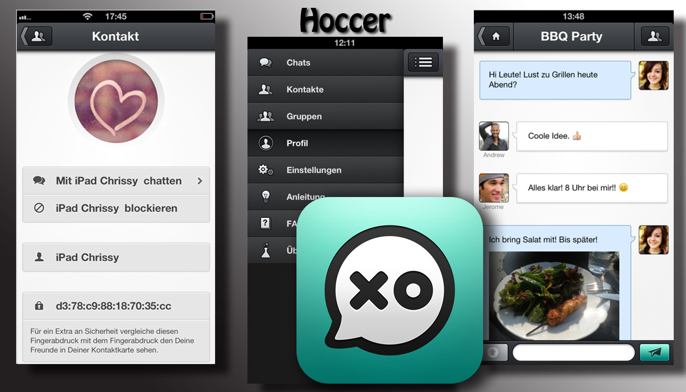 Bei „Hoccer XO“ wird ebenfalls eine Ende-zu-Ende-Verschlüsselung angeboten. Es sind zwar (noch) keine Emoticons verfügbar, aber Herr Glozbach de Cabarrus schätzt die Chancen seiner App trotzdem gut ein. Er setzt auf die Datensicherheit, außerdem ist von Mai bis Juni eine Fusion beider Apps geplant.