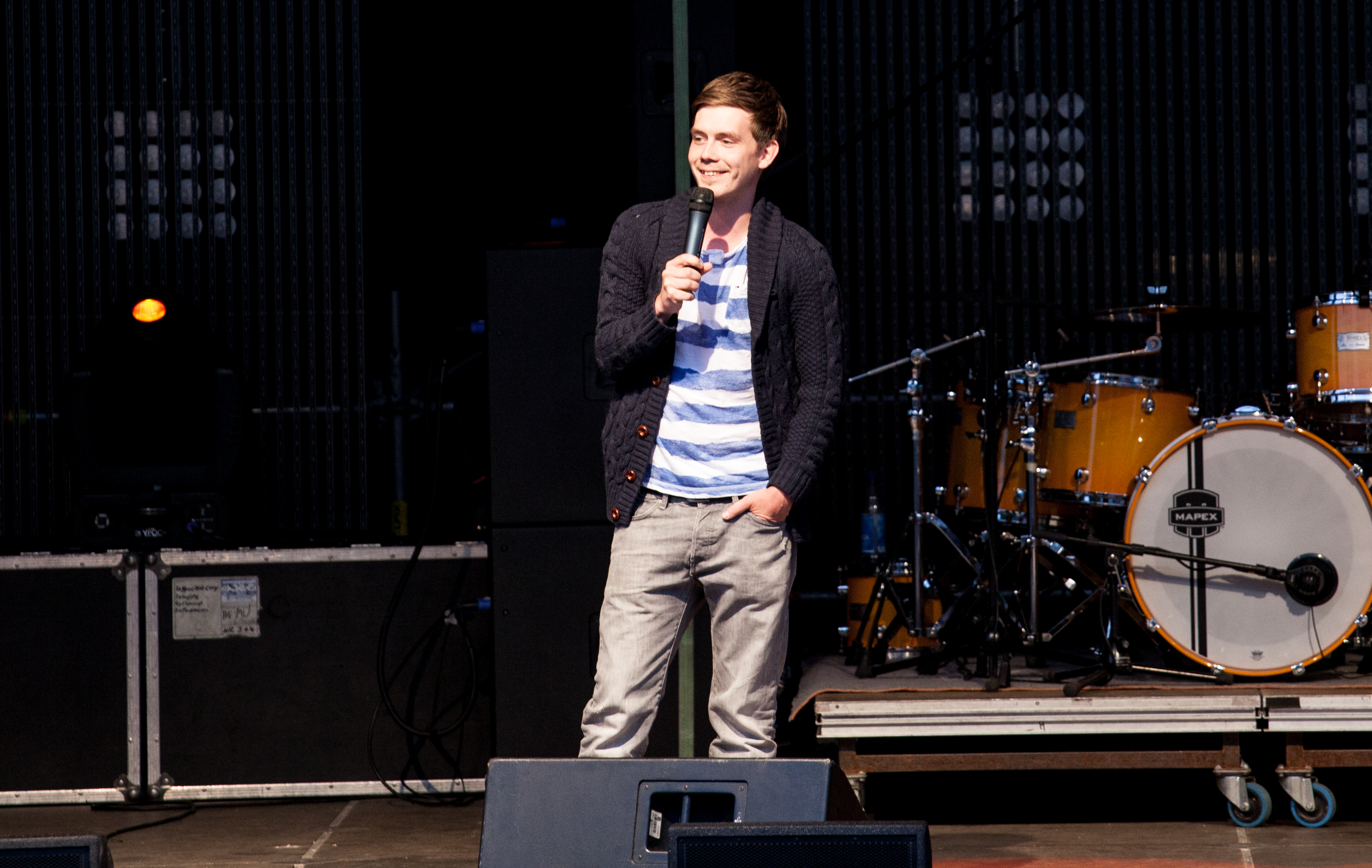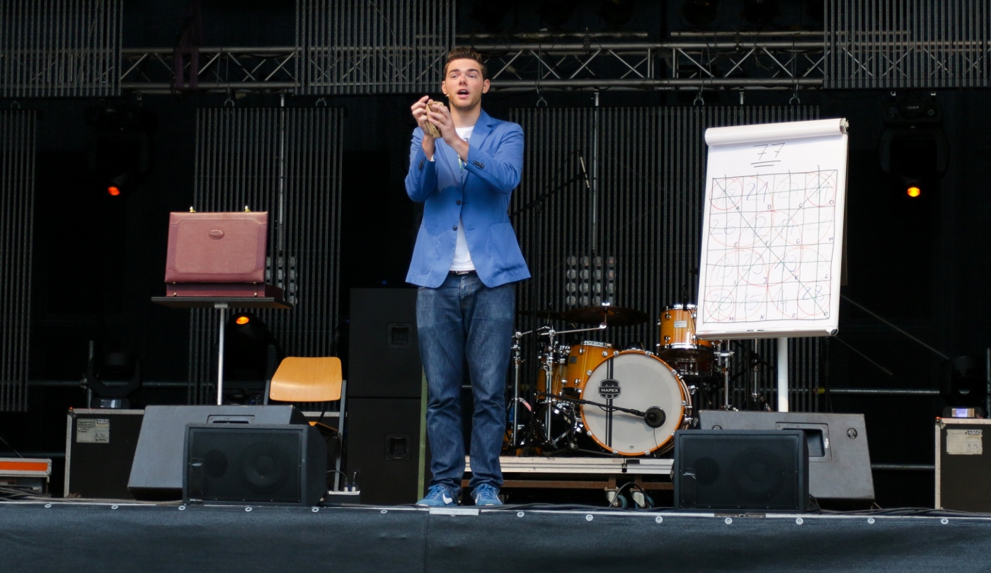 Auf der gigantischen Bühne am Grunert-de-Jácome-Bau (Haus 6) verzauberte Ben David zunächst die Menge mit seiner Magic-Show. Der Künstler ließ es sich nicht nehmen, mehr oder weniger Freiwillige in seine Bühnenshow mit einzubeziehen. Neben Kartentricks und dem mysteriösen magischen Quadrat zeigte er einen Trick mit drei Seilen, der die Geschichte von drei Freunden erzählt. Der sympathische Nachwuchszauberer lieferte eine unterhaltsame Show, auch wenn das zunächst etwas zurückhaltende Publikum erst langsam auftaute. Bei Benny Kaltenbach konnten dann die Lachmuskeln trainiert werden. Der Berliner Komiker erzählte von Geschichten, wie sie das Leben schreibt, von Problemen des Single-Daseins und schmutzigen Witzen seines Opas. Herzhafte Lacher an Stellen, wo sie keiner erwartet hätte, blieben nicht aus.