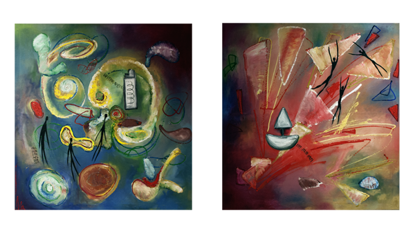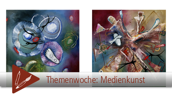 Gollers Bildgruppe „Vier Elemente“ im Durchgang des Medienzentrums war Teil eines multimedialen Projektes, das er schon 1999 mit anderen Künstlern realisierte. „Die Gemälde beschäftigen sich mit dem Ganzen und dem Einzelnen, der Symbiose und Individualisierung und versuchen mit einer Balance zu antworten“, beschreibt der ehemalige Medientechnikstudent sein Werk.