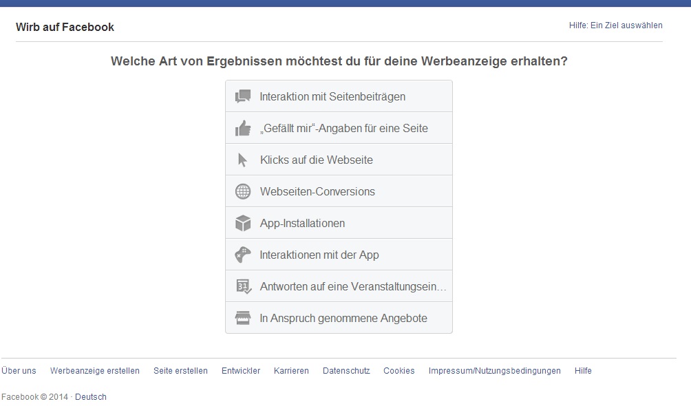 - Für die Werbung der eigenen Page bietet Facebook diese Kategorien.