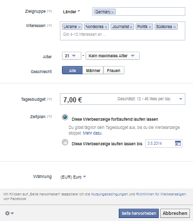 Ähnlich ist es auch bei einer eigenen Facebook Page oder einer Seite für ein Blog. Im Gegensatz zu anderen Websites machen sie den Nutzer direkt auf ihre Hilfe aufmerksam und bieten eine individuelle Hervorhebung des Profils an. Werbeanzeigen können für vier bis fünfzehn Euro erworben werden, um so besser auf sich aufmerksam zu machen. Hier kann man auch einen Zeitraum für die Promotion wählen. Um die richtigen Leute anzusprechen, die man für sich gewinnen möchte, gibt es ebenfalls die Möglichkeit, die Nationalität, Alter und Geschlecht für die möglichen Interessenten festzulegen. Dadurch gibt Facebook die höhere Sicherheit, dass es bei den Richtigen ankommt. Hat man sich seine neuen Fans zusammengestellt, kann bei der Bezahlung zum Beispiel zwischen Visa oder PayPal entschieden werden.