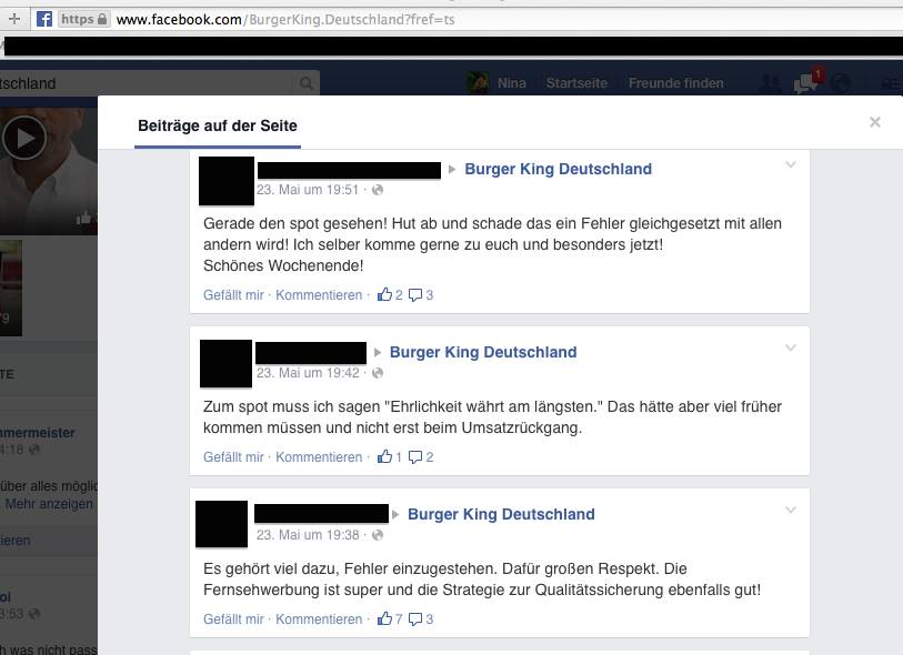 Auch auf der Facebook-Seite von Burger King Deutschland gab es entschuldigende Posts des Unternehmens, jedoch geschah dies erst, als der Shitstorm schon in vollem Gange war.