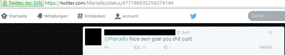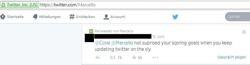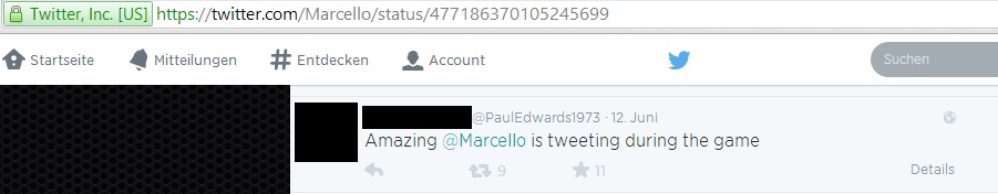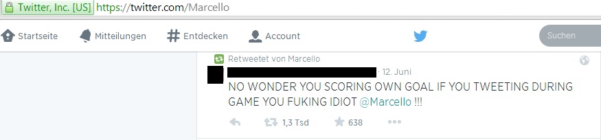 Beim Eröffnungsspiel der Fußball-Weltmeisterschaft 2014 spielte Gastgeberland Brasilien gegen Kroatien. In der 11. Minute schoss der brasilianische Verteidiger Marcelo da Silva Júnior ein Eigentor – was folgte, war ein riesiger Shitstorm via Twitter. Jedoch beschwerten sich die wütenden Fans beim falschen Marcello – einem Model aus England, dessen Twittername „@marcello“ ist. Der brasilianische Nationalspieler heißt auf Twitter jedoch „@12marceloV“. Die Tweets, die der falsche Marcello erhielt, gingen wahrlich unter die Gürtellinie: