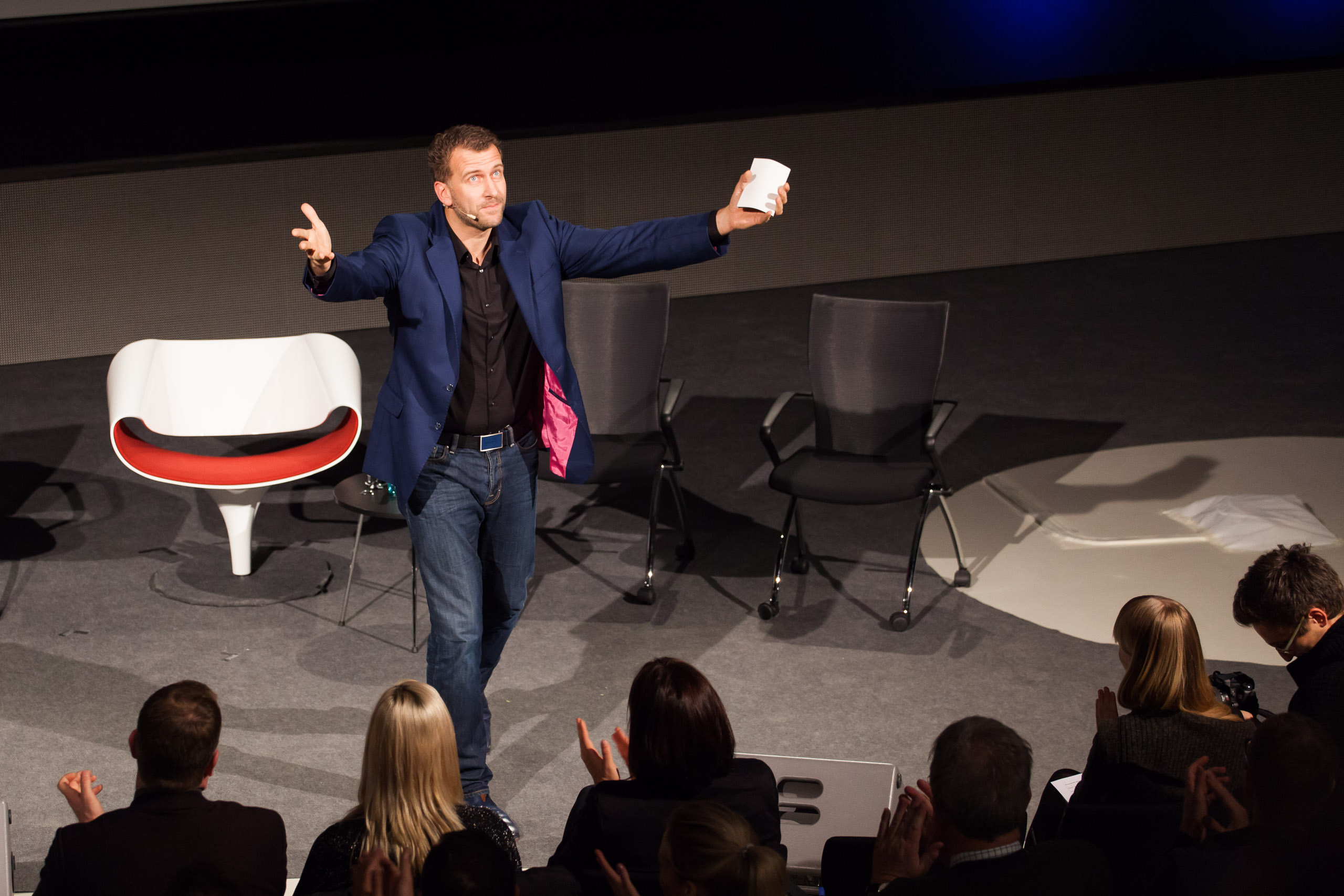 - Moderator für den Abend, René Kindermann, heizt das Publikum vor der Diskussion ordentlich an.