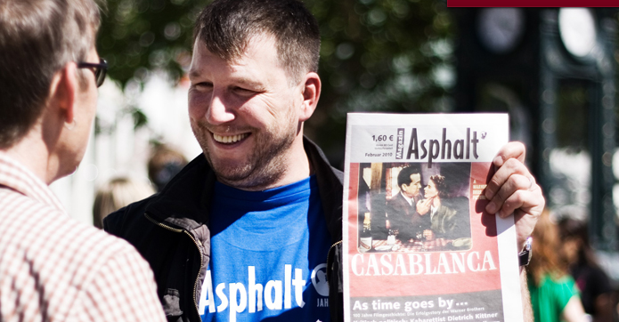 Im Gegensatz zur „KiPPE” handelt es sich beim „Asphalt Magazin” um ein Produkt der alten Bundesländer. Auf die Frage nach der Situation im Gründungsjahr verweist Vertriebsleiter Helmut Jochens, vielleicht deshalb, nicht zuerst auf die Wiedervereinigung, sondern auf die britische „Big Issue”. Sie sei den Zeitungen in deutschen Großstädten wie München, Berlin und Hamburg ein Vorbild gewesen. Das „Asphalt Magazin” ging übrigens aus einer wortwörtlichen Obdachlosen-Zeitung hervor, die von der hannoverschen Initiative obdachloser Bürger, kurz „HIOB”, herausgegeben wurde: geschrieben mit der Schreibmaschine, kopiert und getackert. Helmut Jochens meint: „Hätte damals nicht der Leiter des Diakonischen Werks das Projekt unterstützt, wäre es wohl nicht von langer Dauer gewesen. Man muss sich vor Augen halten, dass schon ein regelmäßiger Treffpunkt für Obdachlose nicht selbstverständlich ist.”